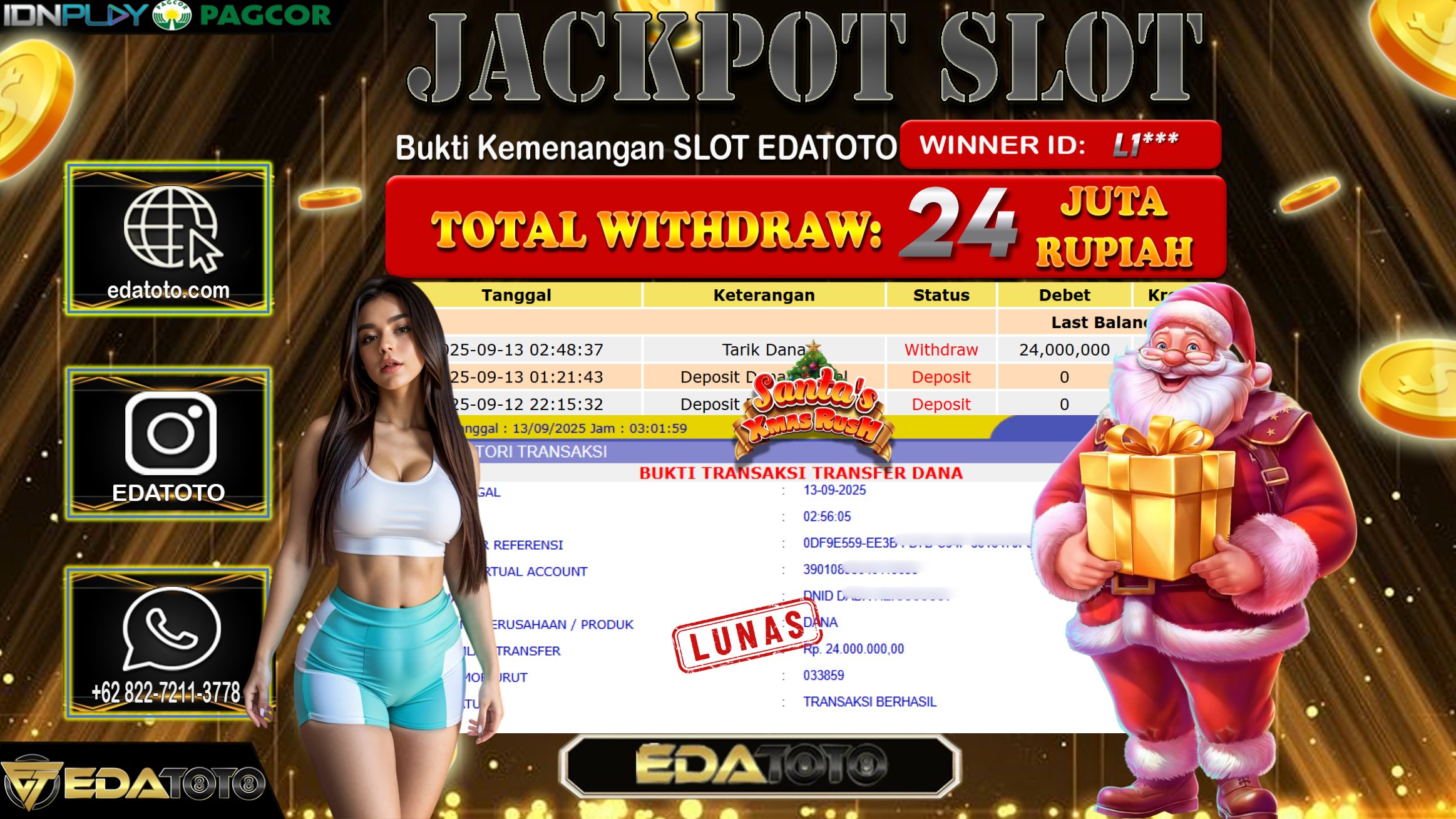 Selamat Kepada Pemilik user ID : L1*** Hari/Tanggal : Sabtu/ 13, September 2025 Jackpot : Rp. 24.000.000 JT Permainan : . . .