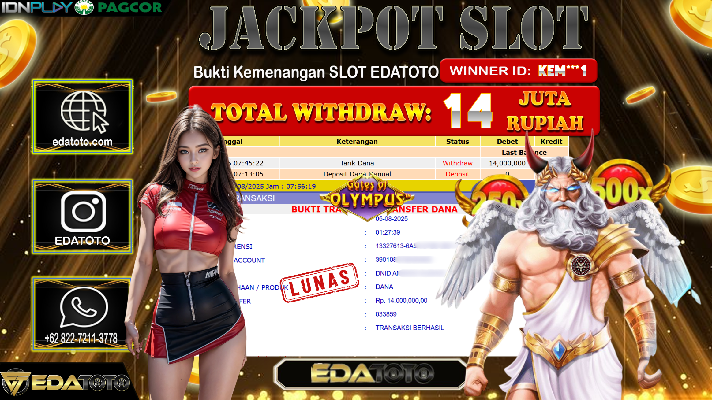 Selamat Kepada Pemilik user ID : Kem***1 Hari/Tanggal : Selasa/ 5, Agustus 2025 Jackpot : Rp. 14.000.000 JT Permainan : . . .