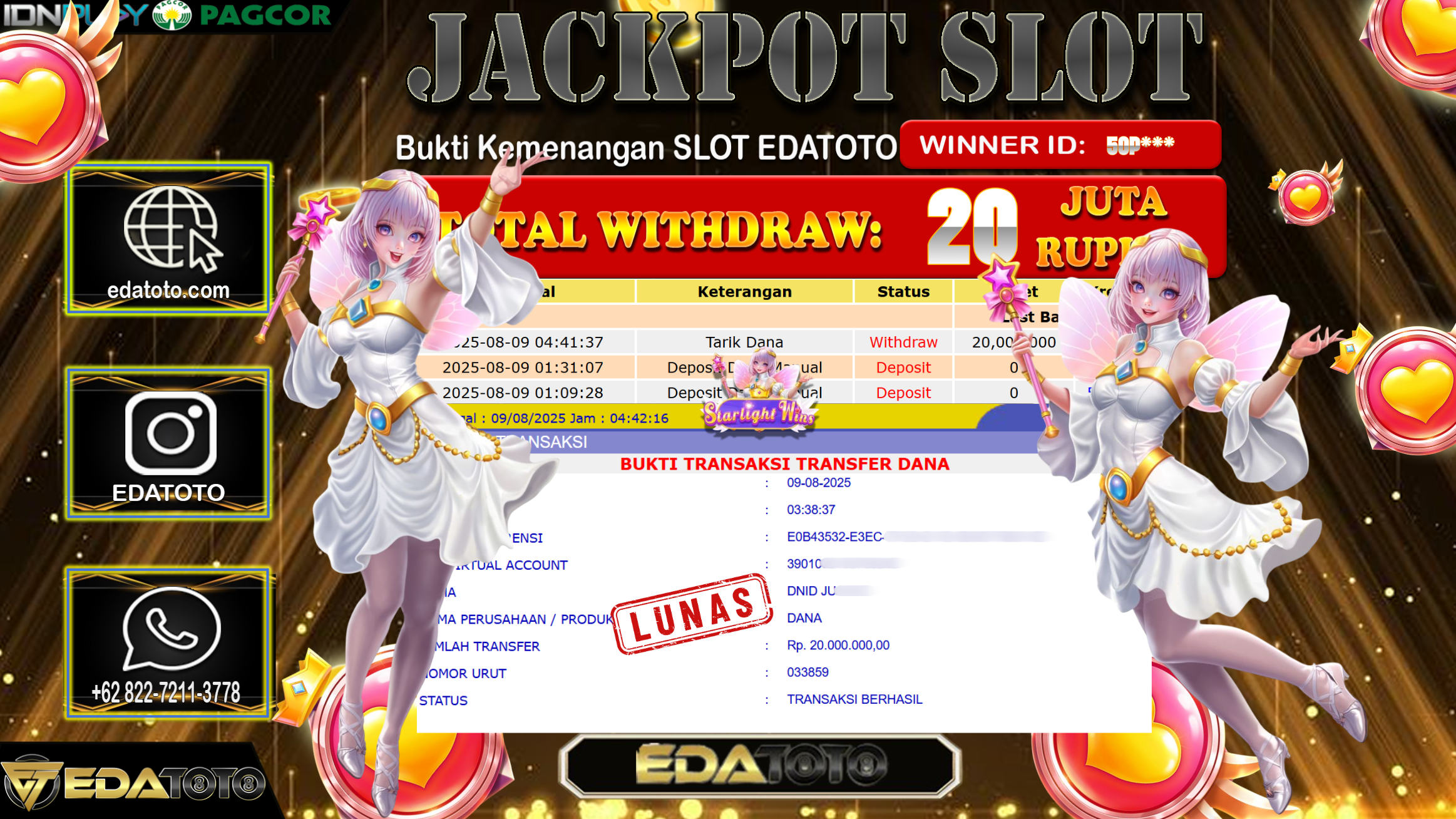 Selamat Kepada Pemilik user ID : 50P*** Hari/Tanggal : Sabtu/ 9, Agustus 2025 Jackpot : Rp. 20.000.000 JT Permainan : . . .