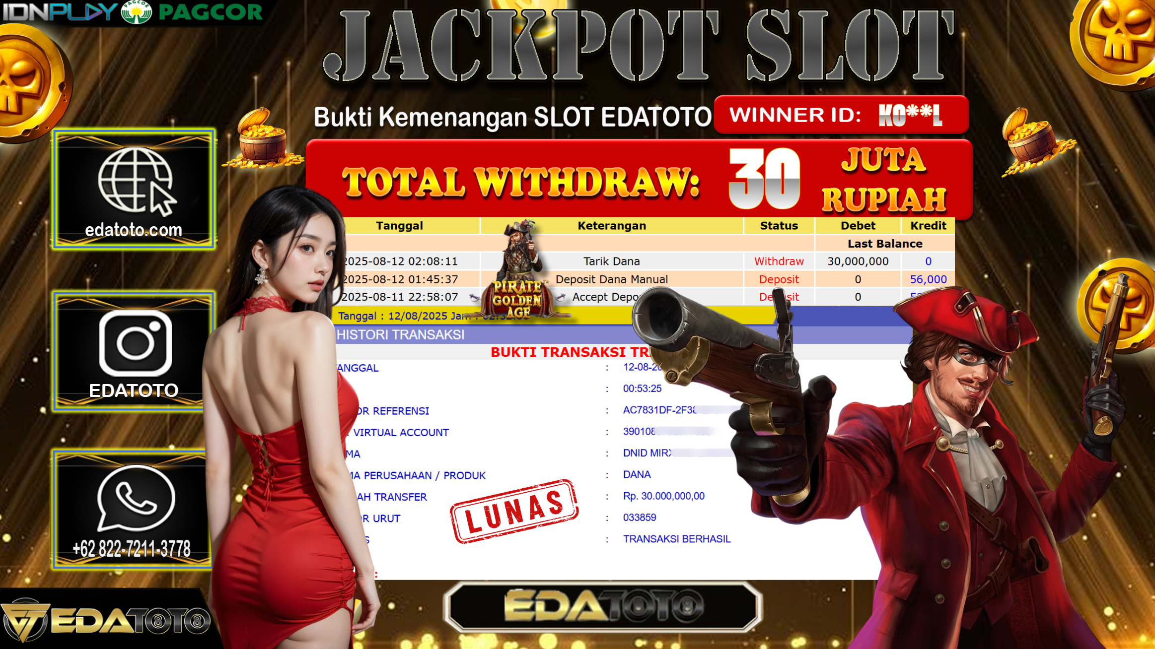 Selamat Kepada Pemilik user ID : K0**L Hari/Tanggal : Selasa/ 12, Agustus 2025 Jackpot : Rp. 30.000.000 JT Permainan : . . .