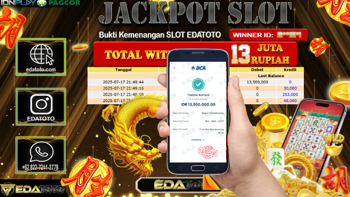 Selamat Kepada Pemilik user ID : M**NE*1 Hari/Tanggal : Jumat/ 18, Juli 2025 Jackpot : Rp. 13.500.000 JT Permainan : Mahjong . . .
