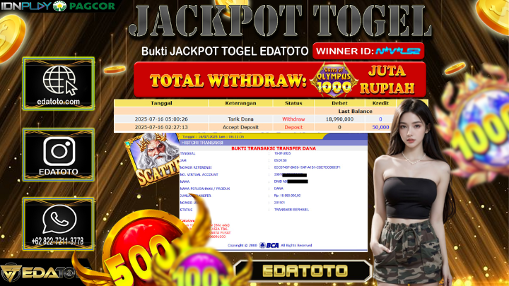Selamat Kepada Pemilik user ID : N**V*LS2 Hari/Tanggal : Rabu/ 16, Juli 2025 Jackpot : Rp. 18.990.000 JT Permainan : Gates . . .