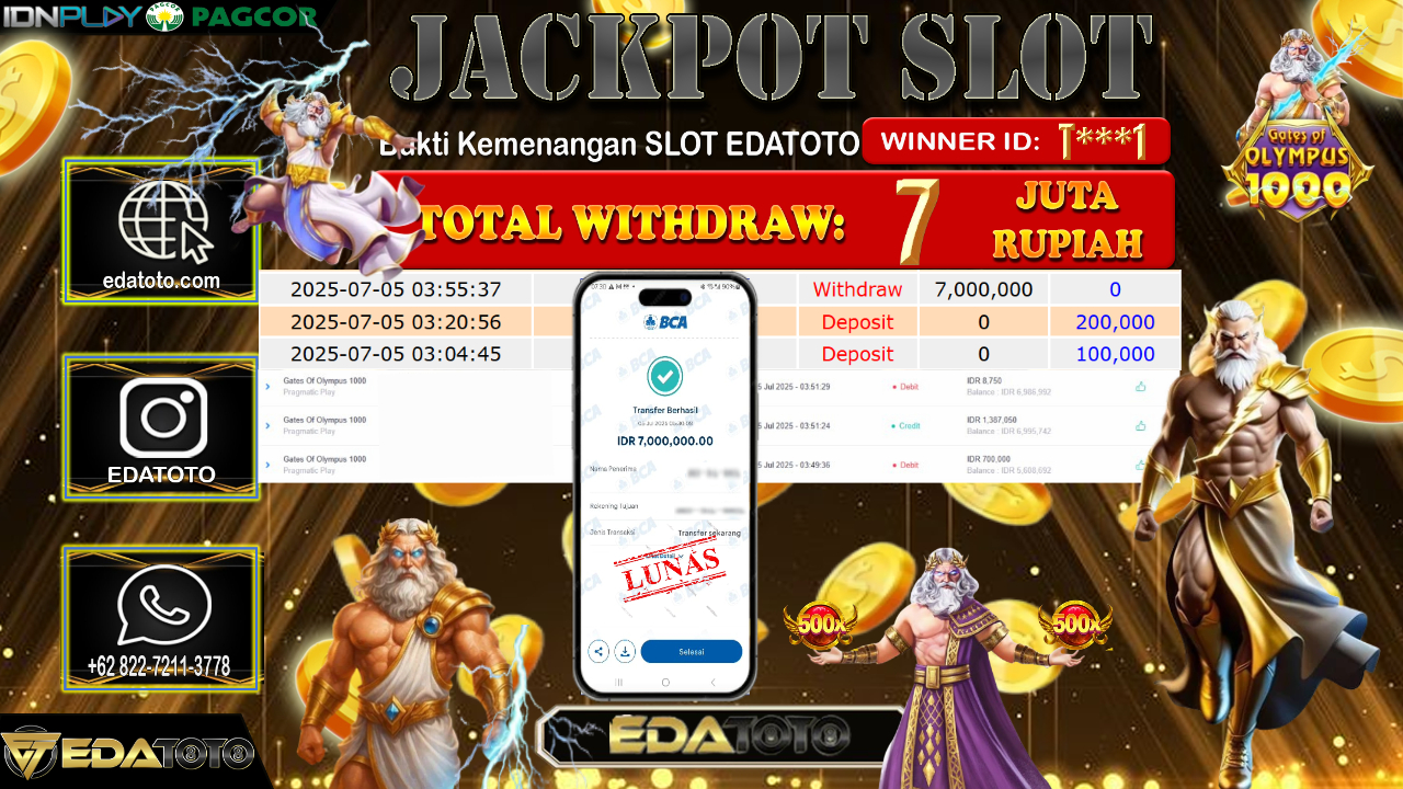 Selamat Kepada Pemilik user ID : T***1 Hari/Tanggal : Sabtu/ 05, Juli 2025 Jackpot : Rp. 7.000.000 JT Permainan : . . .