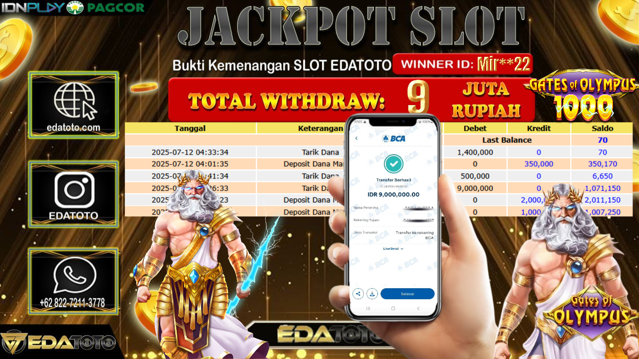 Selamat Kepada Pemilik user ID : Mir**22 Hari/Tanggal : Sabtu/ 12, Juli 2025 Jackpot : Rp. 9.000.000 JT . . .