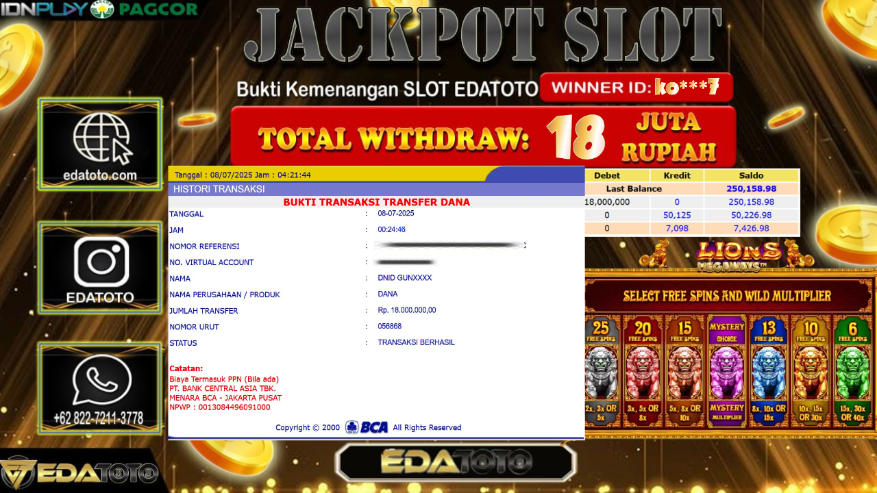 Selamat Kepada Pemilik user ID : Ko***7 Hari/Tanggal : Selasa/ 08, Juli 2025 Jackpot : Rp. 18.000.000 JT Permainan : 5 . . .