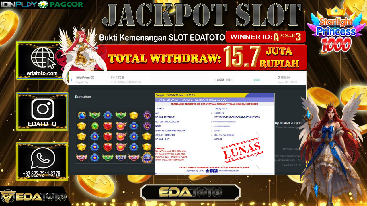 Selamat Kepada Pemilik user ID : A***3 Hari/Tanggal : Sabtu/ 14, Juni 2025 Jackpot : Rp. 15.770.000 JT Permainan : . . .