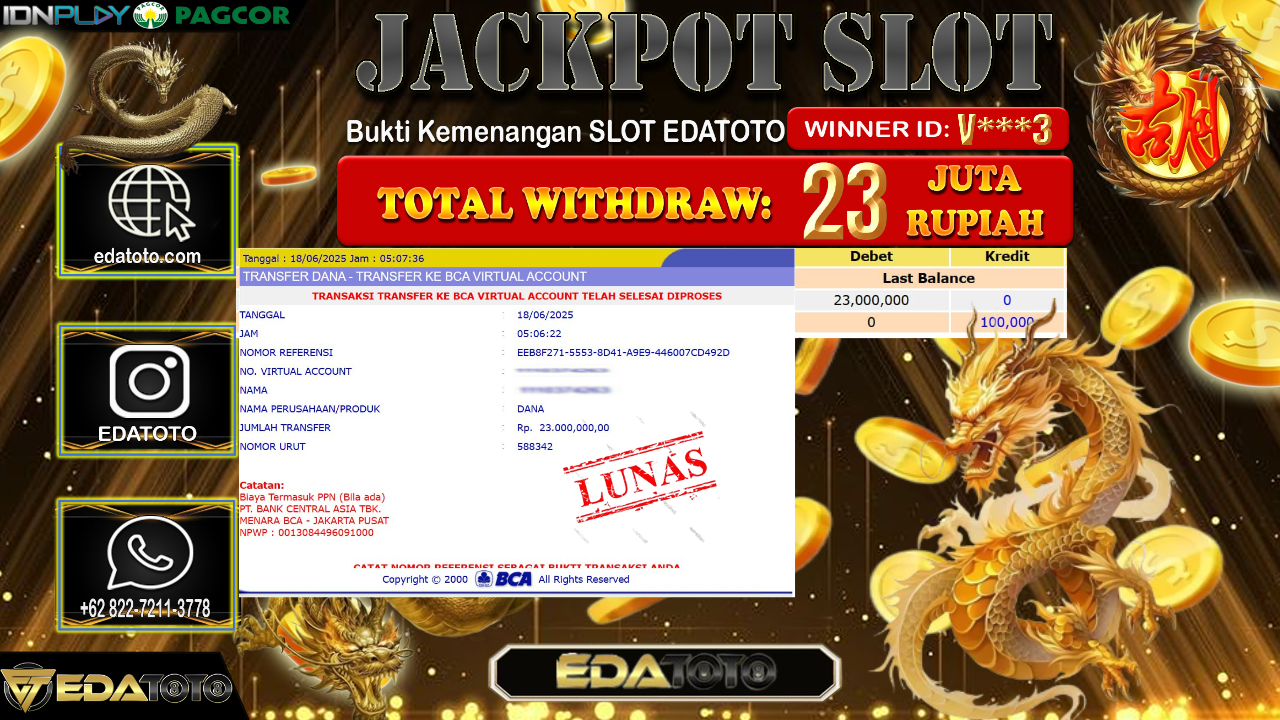 Selamat Kepada Pemilik user ID : v***3 Hari/Tanggal : Rabu/ 18, Juni 2025 Jackpot : Rp. 23.000.000 JT Permainan : Mahjong . . .