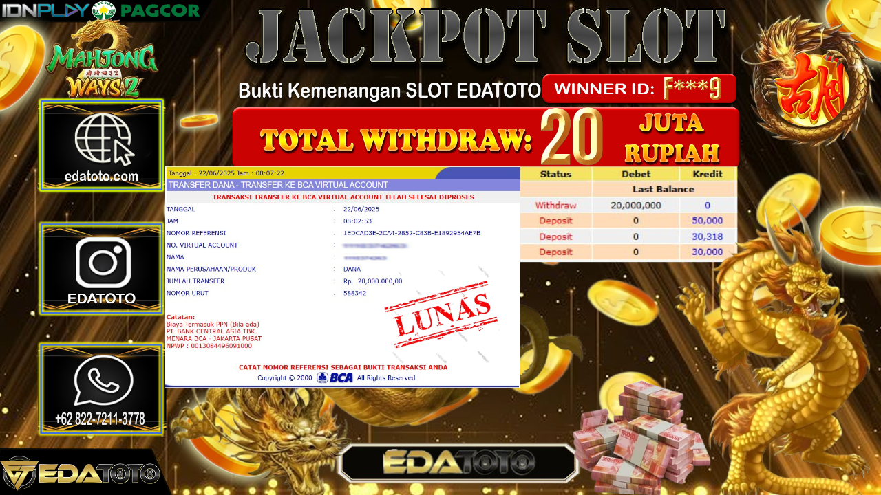 Selamat Kepada Pemilik user ID : F***9 Hari/Tanggal : Minggu/ 22, Juni 2025 Jackpot : Rp. 20.000.000 JT Permainan : Mahjong . . .