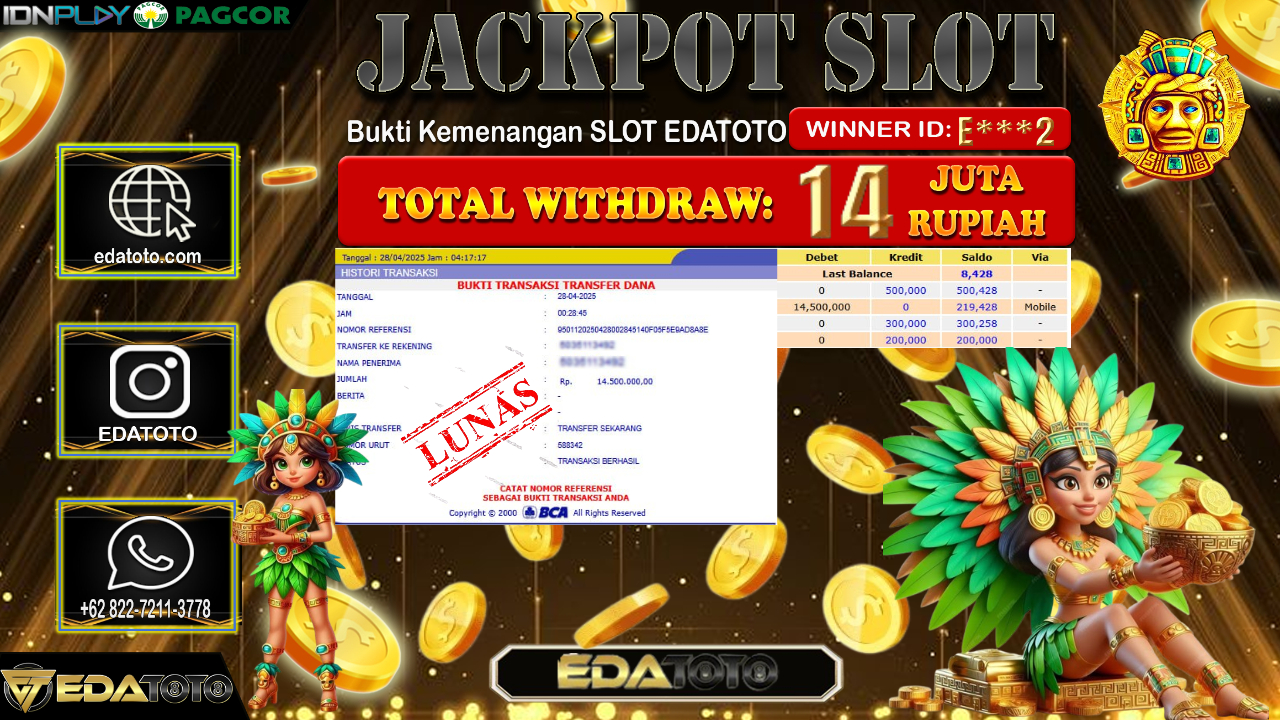 Selamat Kepada Pemilik user ID : E***2 Hari/Tanggal : Senin / 28, April 2025 Jackpot : Rp. 14.500.000 JT Permainan : Aztec . . .