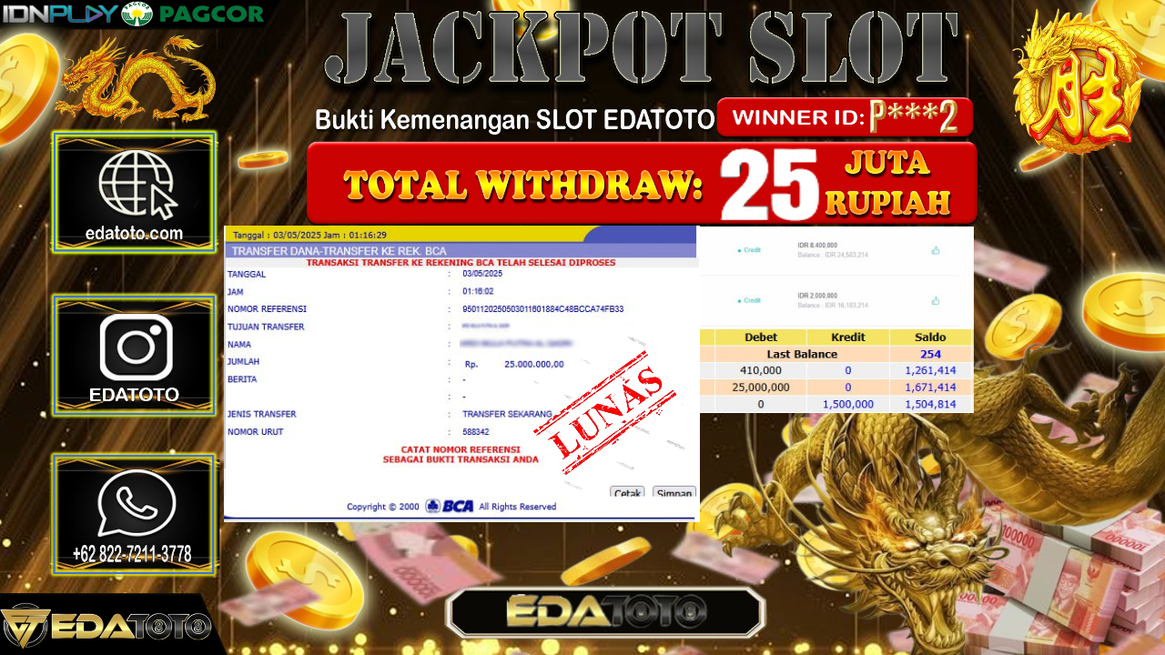 Selamat Kepada Pemilik user ID : P***2 Hari/Tanggal : Sabtu/ 03, Mei 2025 Jackpot : Rp. 25.000.000 JT Permainan . . .