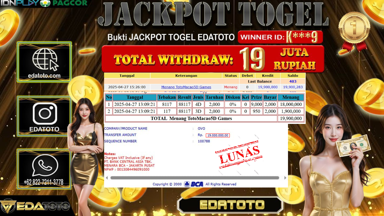Selamat Kepada Pemilik user ID : K***9 Hari/Tanggal : Minggu/ 04, Mei 2025 Jackpot : Rp. 19.000.000 JT Permainan . . .