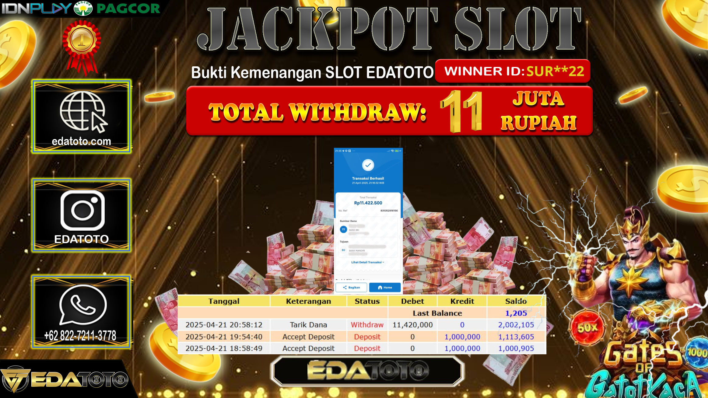 Selamat Kepada Pemilik user ID : SUR**22 Hari/Tanggal : Selasa/ 22 , April 2025 Jackpot : Rp. 11.000.000 JT Permainan . . .