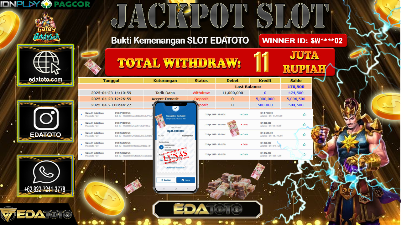 Selamat Kepada Pemilik user ID : SW****02 Hari/Tanggal : Kamis / 24 , April 2025 Jackpot : Rp. 11.000.000 JT . . .
