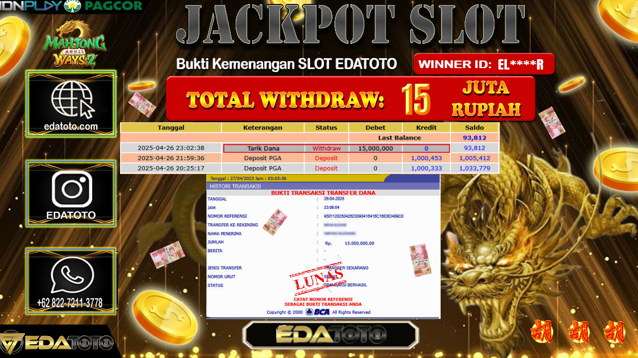 Selamat Kepada Pemilik user ID : EL****R Hari/Tanggal : Minggu / 27, April 2025 Jackpot : Rp. 15.000.000 JT Permainan : MAHJONG . . .