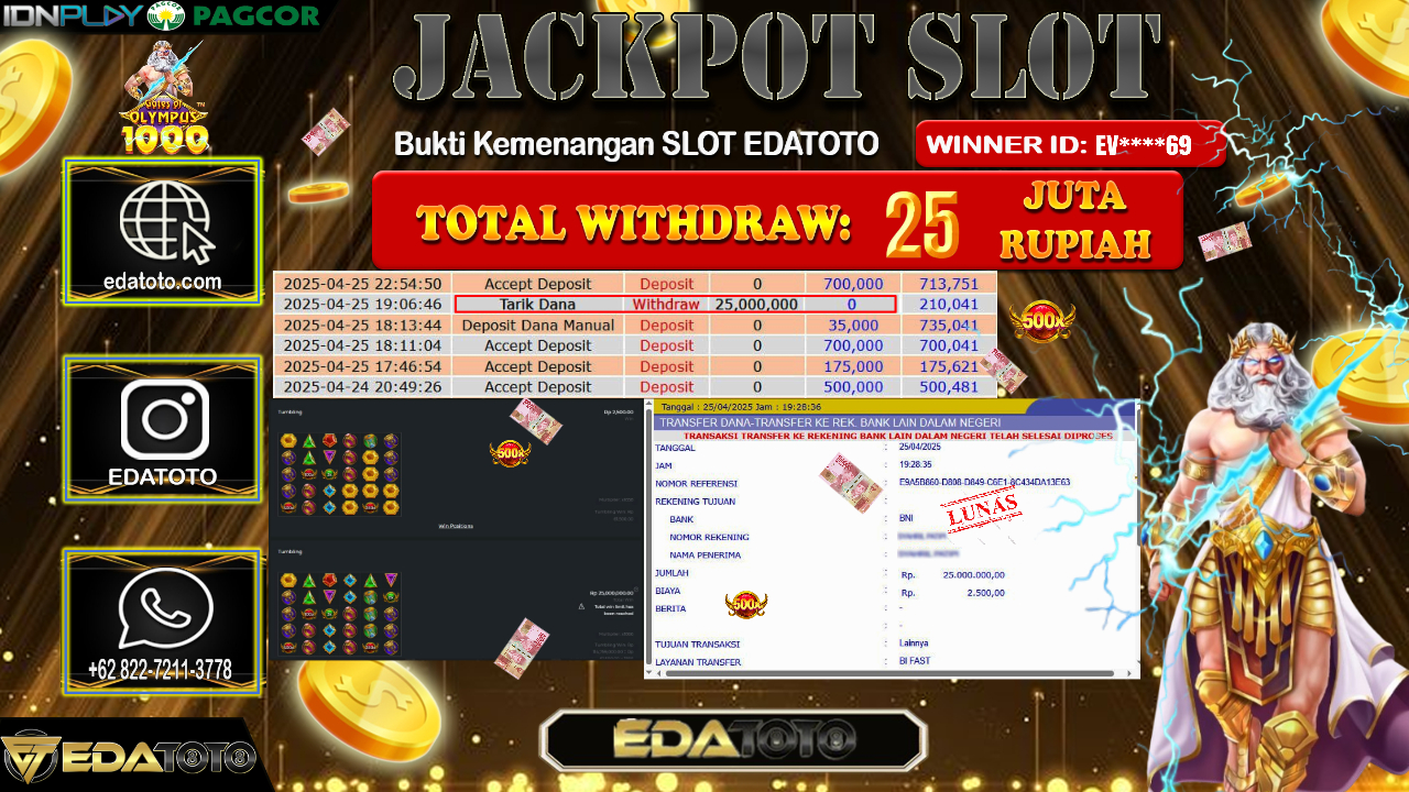 Selamat Kepada Pemilik user ID : EV****69 Hari/Tanggal : Sabtu / 26 , April 2025 Jackpot : Rp. 25.000.000 JT Permainan . . .