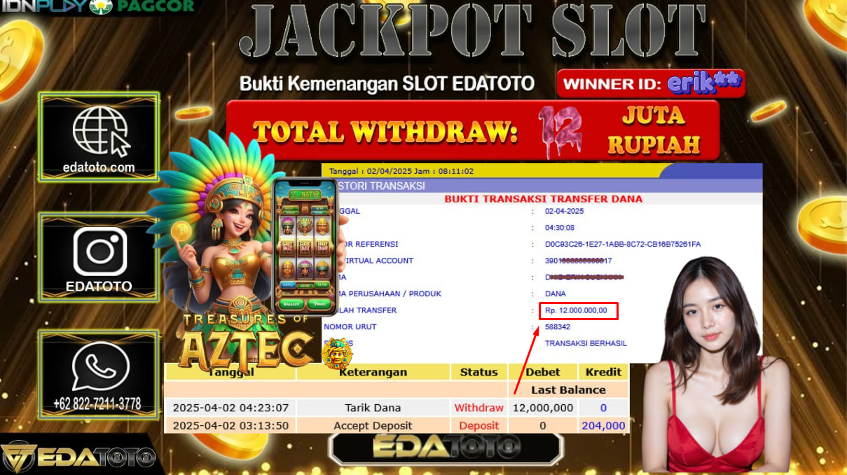 Selamat Kepada Pemilik user ID : erik** Hari/Tanggal : Sabtu / 2 , April 2025 Jackpot : Rp. 12.000.000 JT . . .