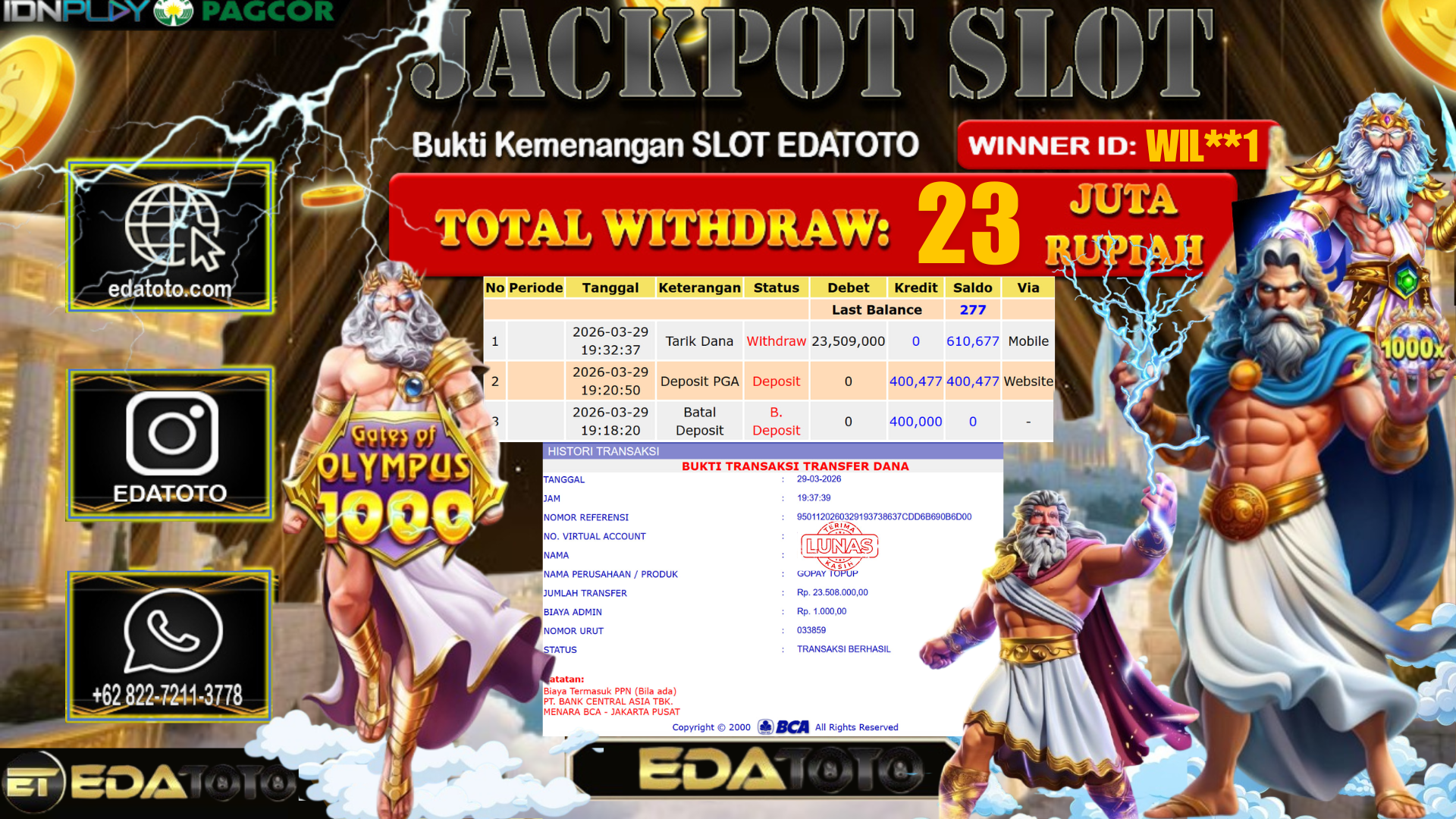 Selamat Kepada Pemilik user ID : WIL**1 Hari/Tanggal : Minggu / 29 MARET 2026 Jackpot : Rp, 20,125,115 JT Withdraw . . .