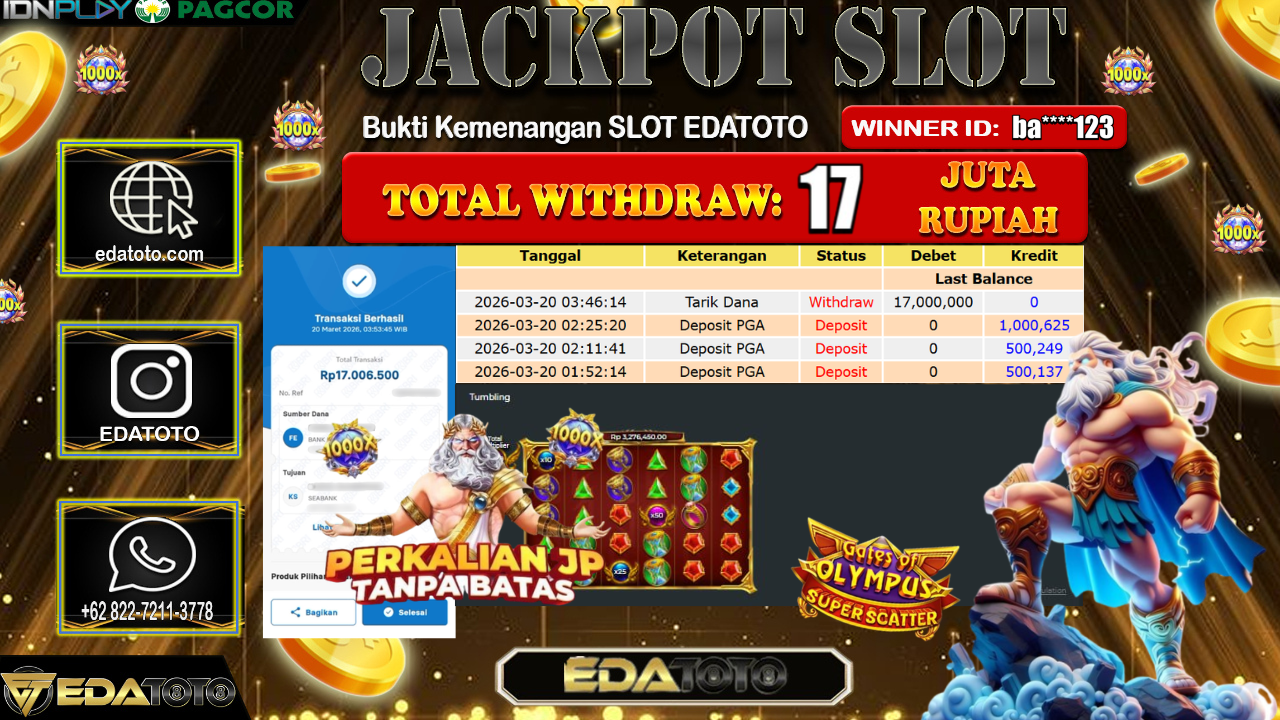 Selamat Kepada Pemilik user ID : ba****123 Hari/Tanggal : Jumat / 20 MARET 2026 Jackpot : Rp, 16,810,320 JT Withdraw . . .