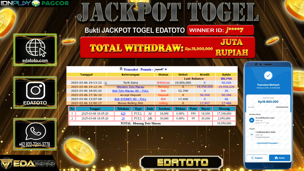Selamat Kepada Pemilik user ID : j****7 Hari/Tanggal : Kamis / 06 , MARET 2025 Jackpot : Rp. 19.900.000 JT Permainan . . .